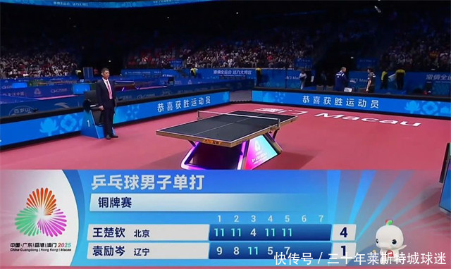全运会乒乓球男单铜牌战,王楚钦4-1战胜袁励岑,获得全运会男单铜牌,比分是11-9、11-8、4-11、11-5、11-7。